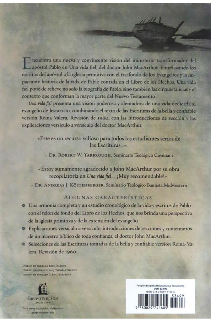 ?Pablo, siervo de Jesucristo... ?Así es la típica autopresentación de Pablo, un título sin pretensiones para la figura más influyente del cristianismo, aparte de Cristo mismo. Ahora, por primera vez, experimente los escritos cambiantes del mundo de Pablo en el contexto completo de su historia de vida: desde el fariseo y el perseguidor de la iglesia, el converso quebrantado y humilde, hasta el apóstol del evangelio de Jesucristo.Del pastor y maestro Dr. John MacArthur, Una vida fiel es la primera armonía de su tipo entre el mensaje y la vida de Pablo, que reúne las cartas de Pablo, el libro de los Hechos y la importante información de fondo de los Evangelios en una narrativa perfecta y cronológica.Esta obra incluye:? Explicaciones de cada versículo y presentaciones de cada sección de uno de los pastores-maestros más respetados de nuestro tiempo? Versión Reina Valera 1960 del texto de las Escrituras? Un plan de lectura integral. About the Author John MacArthur ha servido como pastor-maestro de Grace Community Church en Sun Valley, California desde 1969. También es presidente de The Master's College and Seminary y se le escucha diariamente en «Gracia a Vosotros», un programa distribuido a nivel internacional en diferentes formatos, para alcanzar a millones cada día. Con más de cinco décadas de ministerio, ha escrito y editado muchos libros incluyendo el ganador del premio Medallón de Oro, La Biblia de estudio MacArthur.
