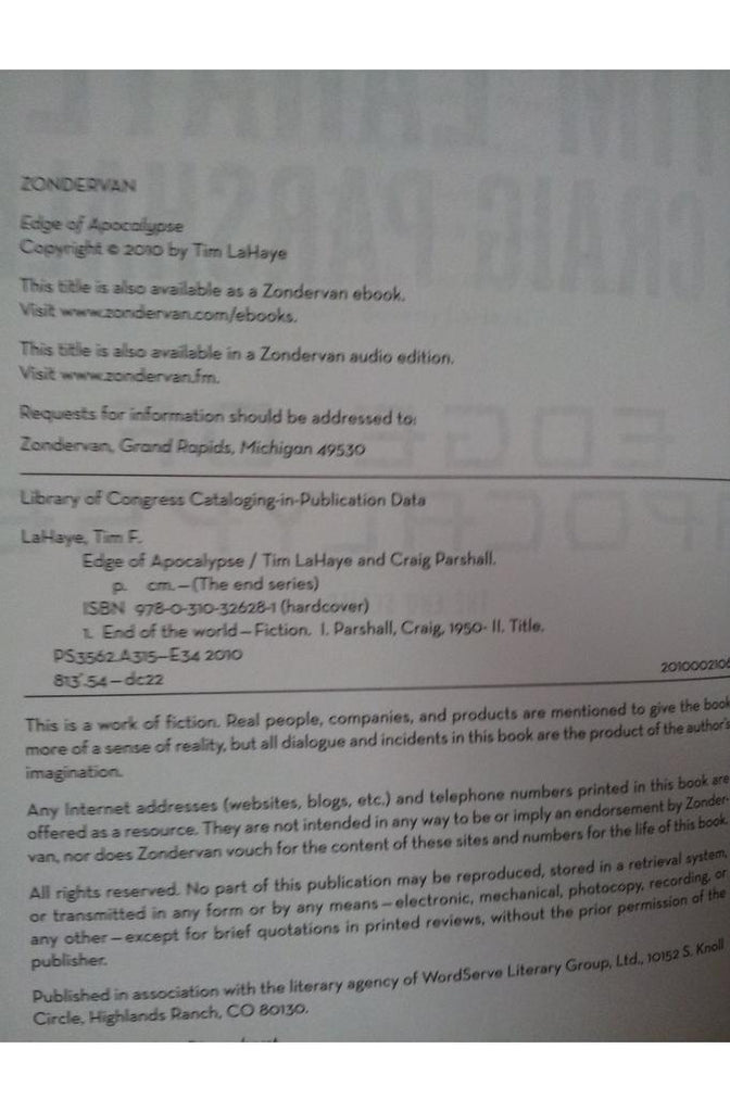 From Tim LaHaye, co-author of the renowned Left Behind series, and Craig Parshall comes an epic story ripped from the headlines of world events and filtered through Scriptural prophecy.Joshua Jordan, former US spy-plane hero now turned weapons designer, has come up with a devastatingly effective new missile defense system-the Return to Sender laser weapon. But global forces are mounting against America, and corrupt White House and Capitol Hill leaders are willing to do anything to stop the nation’s impending economic catastrophe-including selling-out Joshua and his weapon.With help from a group of powerfully connected Christian leaders known as the Patriots, Jordan works to save the nation from economic moral collapse-and to clear his name. As the world events begin setting the stage for the “end of days,” Jordan must consider the personal price he must pay if he is to save the nation he loves.Set in the near future, Edge of Apocalypse chronicles the beginning of The End-the earth-shattering events leading up to the Apocalypse foretold in Revelation.From Tim LaHaye, co-author of the renowned Left Behind series, and Craig Parshall comes an epic story ripped from the headlines of world events and filtered through Scriptural prophecy.Joshua Jordan, former US spy-plane hero now turned weapons designer, has come up with a devastatingly effective new missile defense system-the Return to Sender laser weapon. But global forces are mounting against America, and corrupt White House and Capitol Hill leaders are willing to do anything to stop the nation’s impending economic catastrophe-including selling-out Joshua and his weapon.With help from a group of powerfully connected Christian leaders known as the Patriots, Jordan works to save the nation from economic moral collapse-and to clear his name. As the world events begin setting the stage for the “end of days,” Jordan must consider the personal price he must pay if he is to save the nation he loves.Set in the near future, Edge of Apocalypse chronicles the beginning of The End-the earth-shattering events leading up to the Apocalypse foretold in Revelation.