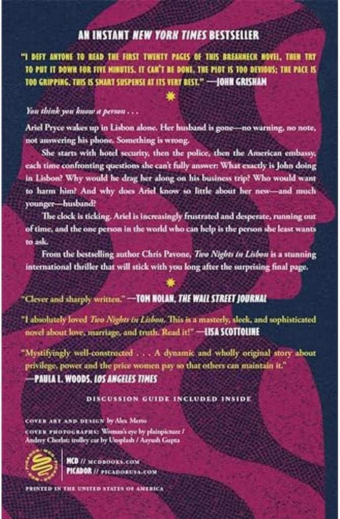 AN INSTANT NEW YORK TIMES AND NATIONAL BESTSELLER“There’s no such thing as a book you can’t put down, but this one was close.” ?Stephen King“Smart suspense at its very best.” ?John GrishamTautly wound and expertly crafted, Two Nights in Lisbon is a riveting thriller about a woman under pressure, and how far she will go when everything is on the line.You think you know a person . . .Ariel Pryce wakes up in Lisbon alone. Her husband is gone?no warning, no note, not answering his phone. Something is wrong.She starts with hotel security, then the police, then the American embassy, each time confronting questions she can’t fully answer: What exactly is John doing in Lisbon? Why would he drag her along on his business trip? Who would want to harm him? And why does Ariel know so little about her new?and much younger?husband?The clock is ticking. Ariel is increasingly frustrated and desperate, running out of time, and the one person in the world who can help is the person she least wants to ask.Bestselling author Chris Pavone delivers sparkling prose and razor-sharp insights in this stunning and sophisticated thriller. Two Nights in Lisbon will stick with you long after the surprising final page.AN INSTANT NEW YORK TIMES AND NATIONAL BESTSELLER“There’s no such thing as a book you can’t put down, but this one was close.” ?Stephen King“Smart suspense at its very best.” ?John GrishamTautly wound and expertly crafted, Two Nights in Lisbon is a riveting thriller about a woman under pressure, and how far she will go when everything is on the line.You think you know a person . . .Ariel Pryce wakes up in Lisbon alone. Her husband is gone?no warning, no note, not answering his phone. Something is wrong.She starts with hotel security, then the police, then the American embassy, each time confronting questions she can’t fully answer: What exactly is John doing in Lisbon? Why would he drag her along on his business trip? Who would want to harm him? And why does Ariel know so little about her new?and much younger?husband?The clock is ticking. Ariel is increasingly frustrated and desperate, running out of time, and the one person in the world who can help is the person she least wants to ask.Bestselling author Chris Pavone delivers sparkling prose and razor-sharp insights in this stunning and sophisticated thriller. Two Nights in Lisbon will stick with you long after the surprising final page.