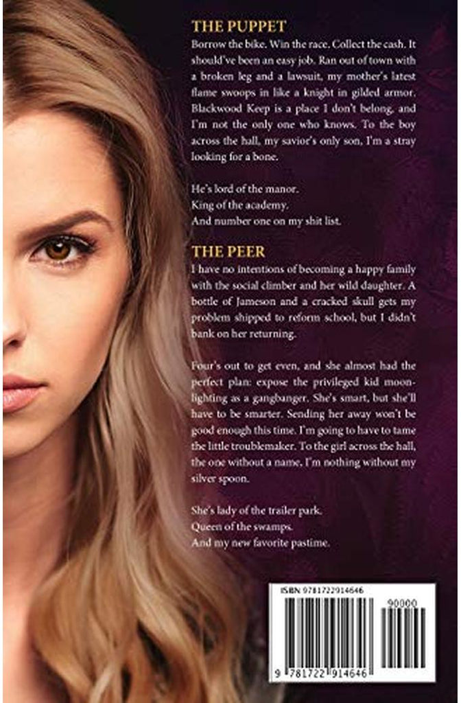 THE PUPPETBorrow the bike. Win the race. Collect the cash. It should’ve been an easy job. Ran out of town with a broken leg and a lawsuit, my mother’s latest flame swoops in like a knight in gilded armor. Blackwood Keep is a place I don’t belong, and I’m not the only one who knows. To the boy across the hall, my savior’s only son, I’m a stray looking for a bone.He’s lord of the manor.King of the academy.And number one on my list. THE PEERI have no intentions of becoming a happy family with the social climber and her wild daughter. A bottle of Jameson and a cracked skull gets my problem shipped to reform school, but I didn’t bank on her returning.Four’s out to get even, and she almost had the perfect plan: expose the privileged kid moonlighting as a gangbanger. She’s smart, but she’ll have to be smarter. Sending her away won’t be good enough this time. I’m going to have to tame the little troublemaker. To the girl across the hall, the one without a name, I’m nothing without my silver spoon.She’s lady of the trailer park.Queen of the swamps.And my new favorite pastime.The Peer and the Puppet is the first installment of a complete series. The plot continues in the following novels. Content suitable for 18+.