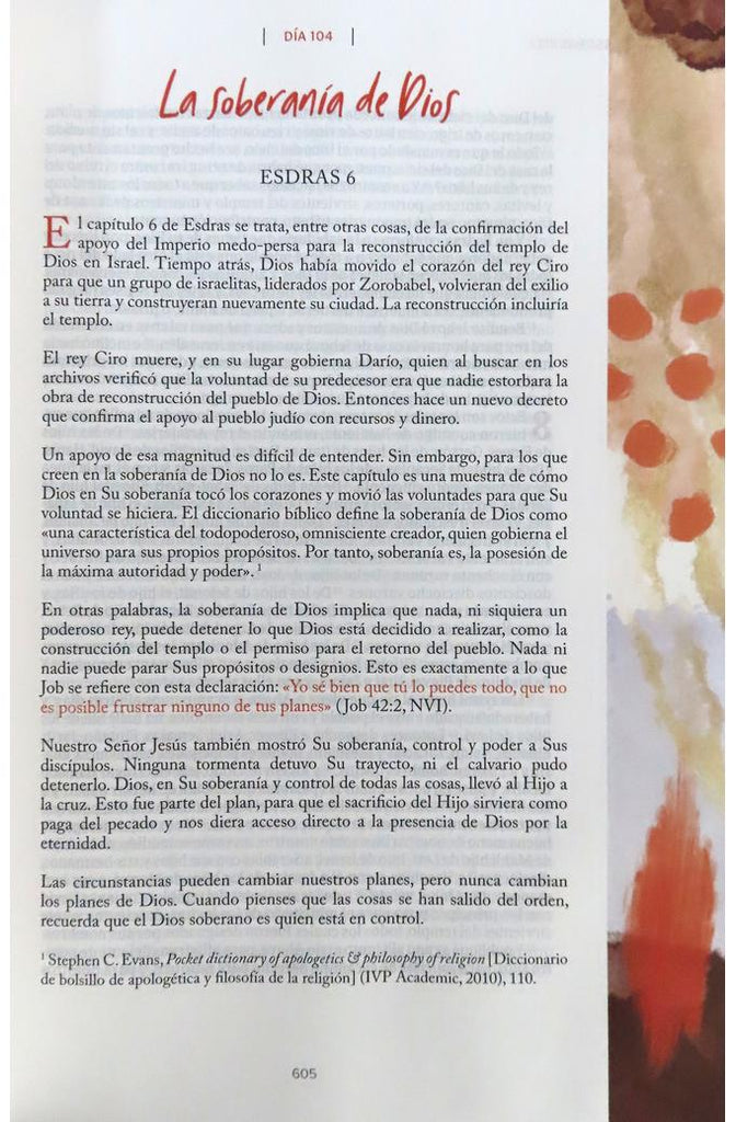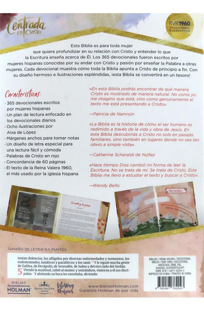 La RVR 1960 Biblia devocionalCentrada en Cristo es un extraordinario recurso que provee herramientas, conocimientos y sabiduría para que como mujeres continuemos nuestro caminar junto a Cristo. Conocemos el relato del Mesías, que nació en un pesebre en Belén, pero ¿sabías que podemos encontrar las profecías sobre Jesús en todo el Antiguo Testamento? Cathy Scheraldi de Núñez y Patricia de Namnún junto a un equipo de mujeres latinas de diversos países, han creado un hermoso viaje de un año para mujeres, para que se sumerjan en la Escritura y puedan ver a Jesús en cada uno de los libros de la Biblia. Desde el jardín del Edén hasta la eternidad, la Biblia devocionalCentrada en Cristo te ayudará a crecer en la Palabra de Dios.Características:365 devocionales Introducción Buenas nuevas de salvaciónPlan de lectura devocional Plan de lectura anual Concordancia Coloridas ilustraciones We know Luke?s account of the Messiah being born in a manger in Bethlehem, but did you know that prophecies about Jesus are also found throughout the Old Testament? Patricia Namnún and Cathy Scheraldi de Núñez, along with their team of Latin American women, have created a beautiful, year-long journey for women for diving into Scripture and seeing Jesus in every book of the Bible. From the Garden of Eden to eternity, this Bible will provide women with tools, knowledge, and wisdom for continuing on their walk with Christ.