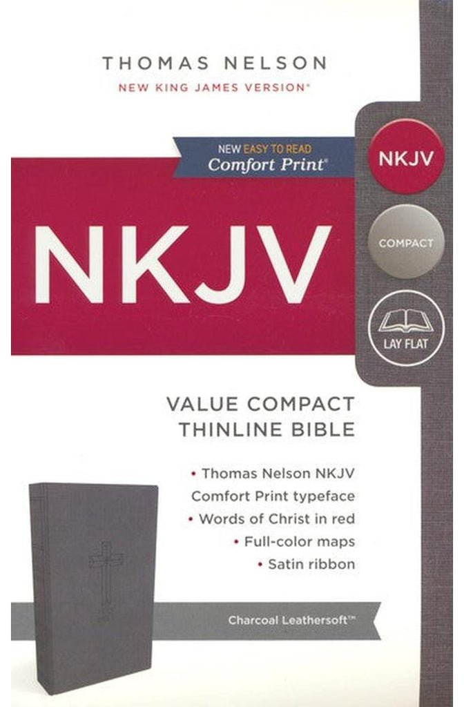 Lightweight and easy-to-carry so you can stay connected to God’s Word anywhere you go.Created to be a go-anywhere Bible, lightweight and portable, with the popular New King James Version set in Thomas Nelson’s custom NKJV font. This easy-to-carry NKJV Compact Thinline Bible features a variety of attractive cover options, words of Christ in red, a reading plan, and full-color maps.Features Include: Ribbon Markers allow you to easily navigate and keep track of where you were reading Presentation page at the front of the Bible lets you personalize this special gift by recording a memory or note Red letter quickly identifies the words of Christ printed in red 30 Days with Jesus call out important events during Jesus’ earthly ministry One Year Reading plan guiding you through the entire Bible in a year Full-color maps are a visual representation of Israel and other biblical locations for better context Clear and readable 6.5-point NKJV Comfort Print