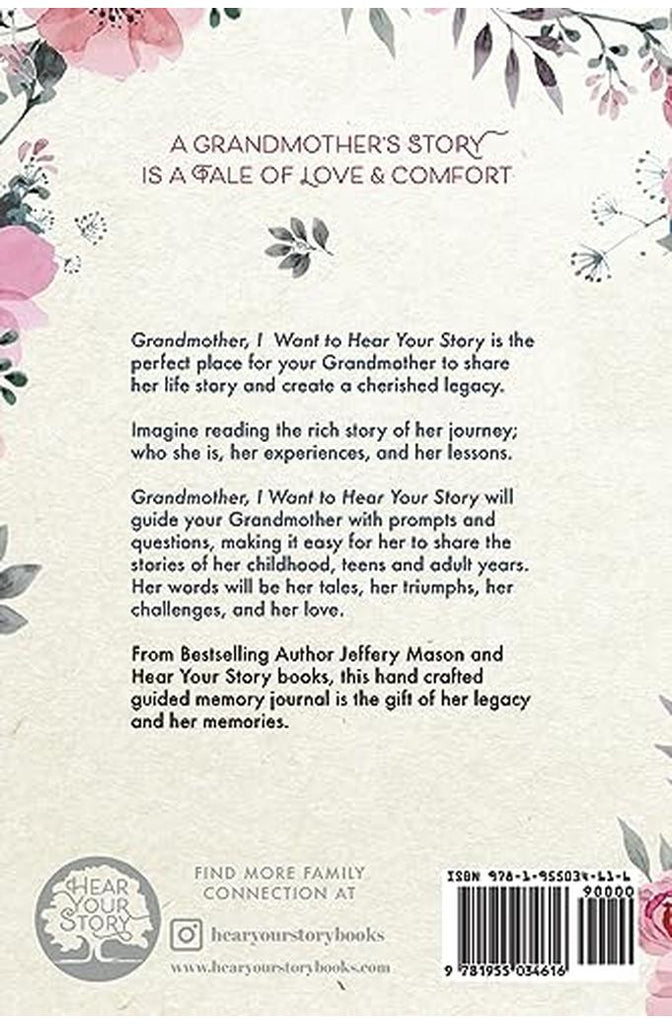 Give Your Grandmother the Gift of Love, Memories, and Legacy.Grandmother, I Want to Hear Your Story is the perfect place for your Grandmother to tell you her special life story while also creating a cherished legacy that you will return to again and again. Imagine reading your Grandmother's words as she shares her journey. Imagine sitting with your children, her grandchildren, and reading her story to them.This is the Original and Best-Selling Way for Your Grandmother to Share Her Life StoryGrandmother, I Want to Hear Your Story uses prompts and questions to guide your Grandmother, making it simple for her to tell the stories of her childhood, her teens, and her adult years. This will be her tale, her triumphs, and her challenges.Imagine Reading About the Details of Her Amazing Life and Journey.Bestselling author Jeffrey Mason and Hear Your Story Books have used their years of publishing experience to create this popular series of guided journals. Grandmother, I Want to Hear Your Story has been expertly designed to give your Grandmother a gift she will love while also creating a cherished legacy. Over 250 expertly created guided prompts to make it simple for your Grandmother to share her memories with you. Each question has plenty of room for your Grandma to write and share her life stories. Give your Grandmother the original memory-guided journal. Tens of thousands have been bought for and cherished by families all over the world. 100% designed, created, and printed in the US.Order Grandmother, I Want to Hear Your Story and give your incredible Grandma a forever gift and the gift of legacy.