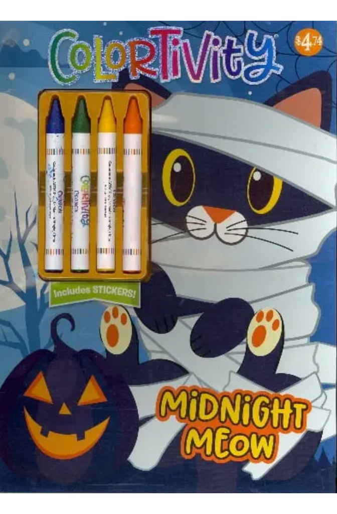 This activity book is filled with spooky puzzles and coloring pages. Includes 4 crayons.