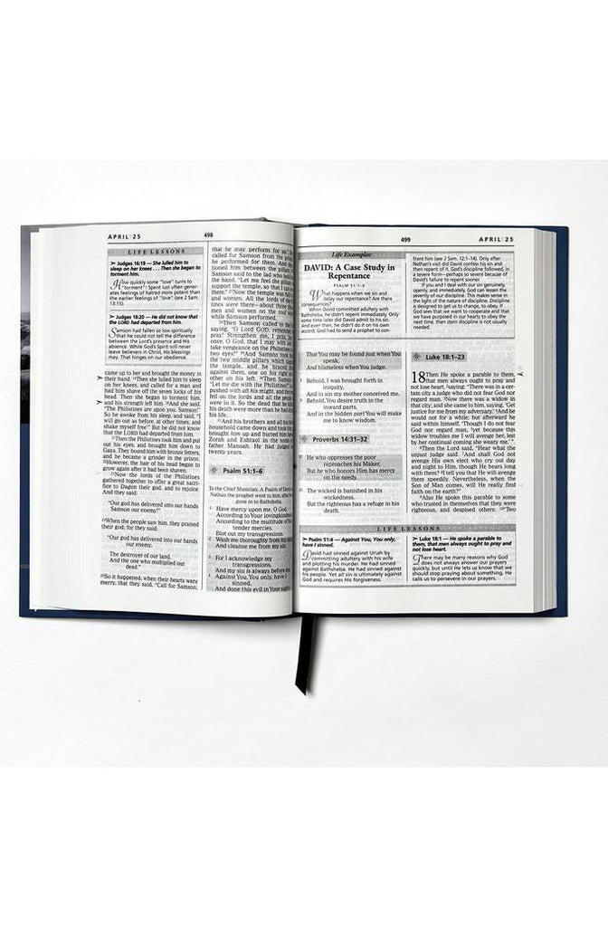 Discover and apply practical, life-changing principles as you read the Word daily.Grow in knowledge and understanding of God through His Word. The text of this New King James Version® (NKJV) Bible is arranged in 365 portions, each including devotional insights derived from Dr. Stanley's Life Principles Bible. The full text of the Bible is broken into daily readings so you can read the Bible in a year. The daily 15-minute readings consist of a passage from the Old Testament, readings from Psalms and Proverbs, and a New Testament passage. Notes from Dr. Stanley shed additional light on each day's readings, and articles apply the Scriptures to our daily lives. This daily Bible is designed to bring more focus and depth to the time spent in God's Word.Helping readers discover and apply biblical principles daily, The Charles F. Stanley Life Principles Daily Bible has been recognized with the ECPA Bronze Award for selling over 300,000 copies across translations.Features include: Complete Bible text divided into daily reading portions Life Principles articles highlight Dr. Stanley’s essentials for Christian living Life Lessons that give insight into Scripture portions Life Examples articles touch on key Bible Characters Answers to Life’s Questions articles show how the Bible applies to the challenges we face in our Christian walk What the Bible Says About articles highlight Scriptures that deal with topics of special interest to believers Travel size edition with a one-inch-thick spine to take with you anywhere you go Easy-to-Read 9.5-point print sizeThe New King James Version-More than 60 million copies sold in 30 years