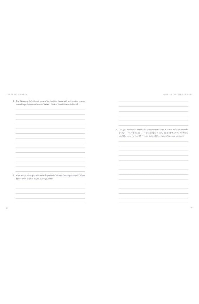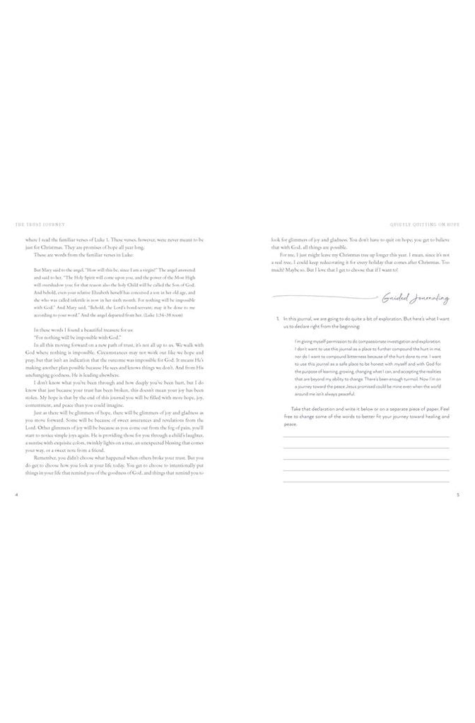 Having your trust broken can be life-altering, but it doesn’t have to be life-ruining. New York Times bestselling author Lysa TerKeurst knows what it’s like to struggle with trust issues. In The Trust Journey, she walks alongside you and shows you what to do when you're skeptical of others, doubtful of your own discernment, and afraid of what God will allow next. Through these pages, she offers practical advice and biblical wisdom so you can heal from past betrayals and find new strength and resilience.The Trust Journey is a full-color, guided companion to help you explore your personal trust issues and unpack crucial concepts from I Want to Trust You, but I Don't. Lysa is also sensitive to the fact that distrust is sometimes the wisest choice to make in some relationships, but it shouldn't be the only choice we make in all of our relationships. It's time to know the joy of moving into new seasons with fresh hope and better tools to build and keep healthier relationships.Because I Want to Trust You, but I Don't is a book that needs to be processed and not just read, Lysa intentionally created this resource for you to be prayerful, self-reflective, and honest with yourself and God. Throughout the interactive portions of this journal, you will: Recognize when a fractured relationship can and cannot be repaired Understand what you need in your relationships to feel safe enough to trust Identify which of the eleven relational red flags are stirring up distrust Wrestle through your questions around why God allows hard things to happen Unpack the physical, emotional, and neurological impact of the betrayals you've experienced Reestablish confidence in your own discernment and start healing from the inside outEach chapter includes: Journaling questions-Lysa will ask specific questions to help you reflect, explore, process, write about, and implement what you're learning. An experiential response-an out-of-the-box, creative exercise for dealing with trust issues. Key quotes from the book and fresh insights from Lysa to help you further unpack the message. Bible verses-wisdom from God's Word. A hope-filled playlist-worship songs chosen to accompany your journaling or worship. Guided prayers-short prayers from Lysa to get you started in giving everything you're struggling with over to God. Beautiful and inspiring photos that are personally meaningful to Lysa.