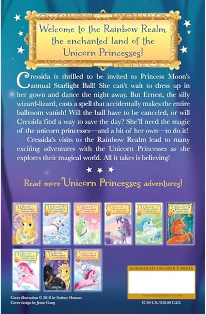 Welcome to an enchanted land ruled by unicorn princesses!Cressida Jenkins, a unicorn-obsessed girl who is sure that unicorns are real, is invited to visit, and readers will be thrilled to journey to the Rainbow Realm along with her! In each story, Cressida is called to help a unicorn princess and her sisters in a magical adventure.When Princess Moon invites Cressida to the annual Starlight Ball in the Night Forest, she can't wait to dress up in her gown and dance the night away. But Ernest the blundering wizard-lizard casts a spell that vanishes the entire ballroom, and the only other available space is filthy--it hasn't been used in years. Will Cressida be able to find a way to decorate the old ballroom? One thing is certain, all the unicorn princesses will need to use their magic together!This magical series is full of sparkle, fun, and friendship.